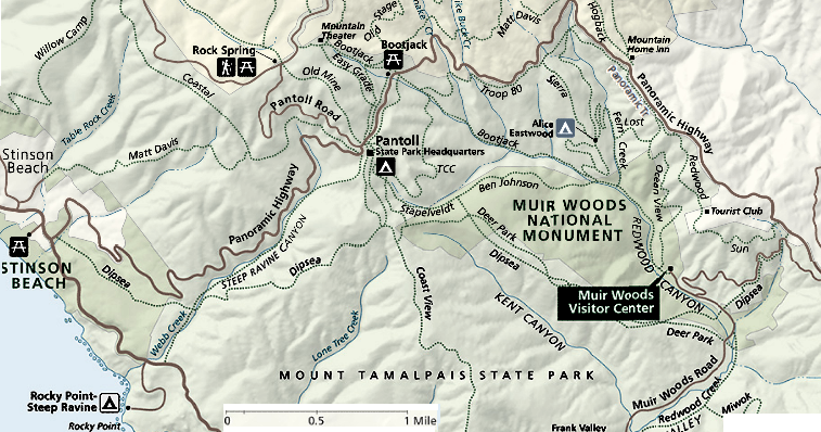 - Wednesday - From the lodge we will hike down into Muir Woods via the Panoramic and Oceanview trails. At the Visitor Center we will meet a ranger who will hike with us in the morning and share his knowledge of the Park. In the afternoon we will drive up to the East Peak Visitor Center in Mt. Tamalpais State Park and hike one of the trails up there.
