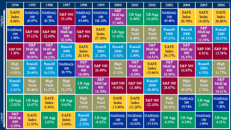 There are two schools of thought (dogmas) on asset allocation and market timing which are related. They concluded that a middle ground approach worked best. i.e. be skeptical of the market timers' claims, but be willing to modestly alter your asset allocation when the evidence in favor of doing so is particularly compelling" In the following chart classes are listed in order of performance of their market indexes. You can see from the following chart that relative class performance varies widely over time. (Performance includes dividends) ![]() Source SummitFunds.com A Spread Sheet where you can experiment with different allocations and see results.