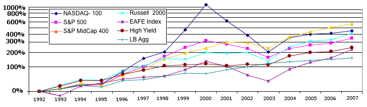 Other Indices:![]() This chart demonstrates the volatility of Nasdaq relative to the other indexes. The Dow Jones Industrial is the only major indicator (Dow, Nasdaq, S&P) which had recovered from the 2000-2002 bear market 4 1/2 years later (as of March 2007), as people moved to more defensive stocks. (Note: It appears the numbers below do NOT include dividends)