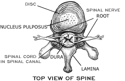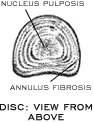 Each vertebra is separated by a DISC. The disc contains an inner gel-like material (NUCLEUS PULPOSIS) surrounded by an outer layer of elastic material (ANNULUS FIBROSIS). Discs help absorb the shock of the thousands of jolts and strains your back must endure every day.