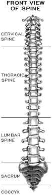 The spine is made up of 24 true VERTEBRAE (singular = vertebra). These are divided into 3 regions: CERVICAL SPINE (neck) - 7 mobile vertebrae; THORACIC SPINE (upper back) - 12 mobile vertebrae; LUMBAR SPINE (lower back) - 5 mobile vertebrae. There are also 2 composite vertebrae called the SACRUM (5 fused vertebrae), and the COCCYX or TAILBONE (4 fused vertebrae). Vertebrae are stacked one on top of the other. They extend from the base of the skull to the coccyx.