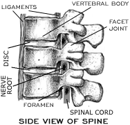 There are small openings on each side of the vertebra called FORAMINA (singular = FORAMEN). These openings provide a tunnel for the SPINAL NERVES that come from the spinal cord and travel to all parts of the body.