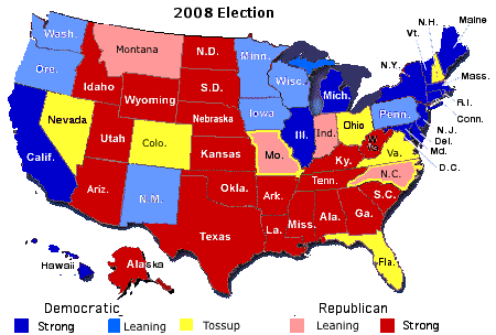 Results (99% tallied): See Results Page Swing States: Obama: Florida, Indiana, Nevada, Ohio, N. Carolina (Kerry states + CO, NM, IA, VA, NC, OH) McCain: Montana, W. Virginia, (Missouri still not final) See: NY Times: Presidential Big Board CNN Election Center 2008 | |||||||||||||||||||||||||||||||||||||||||||||||||||||||||||||||||||||||||||||||||||||||||||||||||||||||||||||||||||||||||||||||||||||||||||||||||||||||||||||||||||||||||||||||||||||||