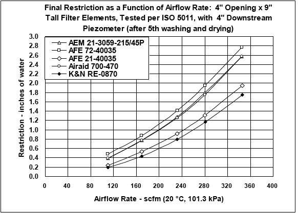 AEM results and Southwest Research tests sponsored by AEM (Efficiency and Dust Capacity of several filters (pdf), AEM test (pdf) -Independent Lab using ISO 12103-1,A2 Fine Test Dust ):