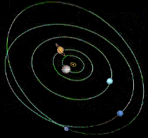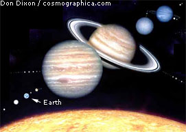 3.Planets to Scale![]() Jupiter is 142,796 km in diameter Reduction = 1 / 6 billion (109) (Distances between planets are not to scale.) |