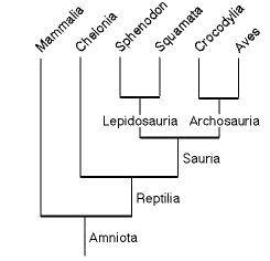 |  Amniota Clad of Living Terrestrial Vertibrates | Chelonia (Tortoises) Sphenodontidae (tuataras) Squamata (amphisbaenians, lizards, and snakes) Crocodylia (Alligators, Crocodiles) Aves (Birds) |
