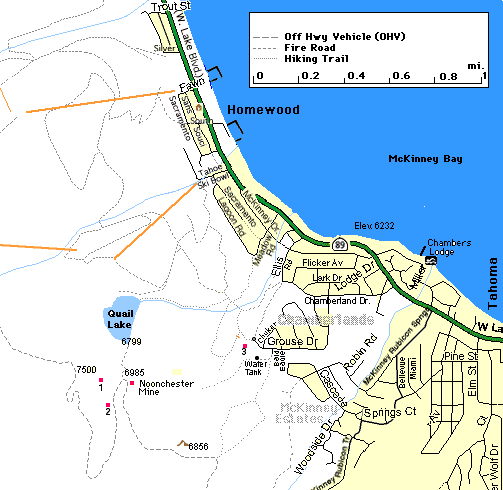 0.4 mi. to Ski Hill 0.6 mi. to Quail Lake Trail 0.5 mi. to Quail LakeTake the bike trail south to Tahoe Ski Bowl Way, turn right (West) to the ski hill parking area. Past the equipment on the left take the fire road up the left boundary the ski hill. (See alternate route back #3 if you would like to avoid the ski hill) After a short steep section the dirt road levels for a short distance.