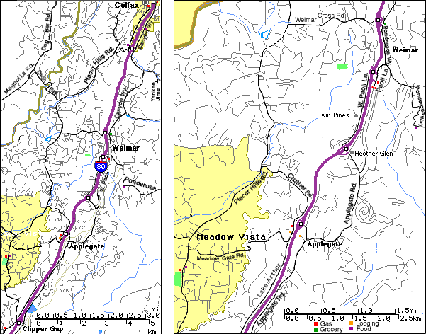 | 61 | Clipper Gap, Meadow Vista [125] | Gas (2 mi. to Meadow Vista) - Winter: During winter there are Porta-Potties every 0.6 mi. on I-80 Eastbound from Clipper Gap to Applegate. | |