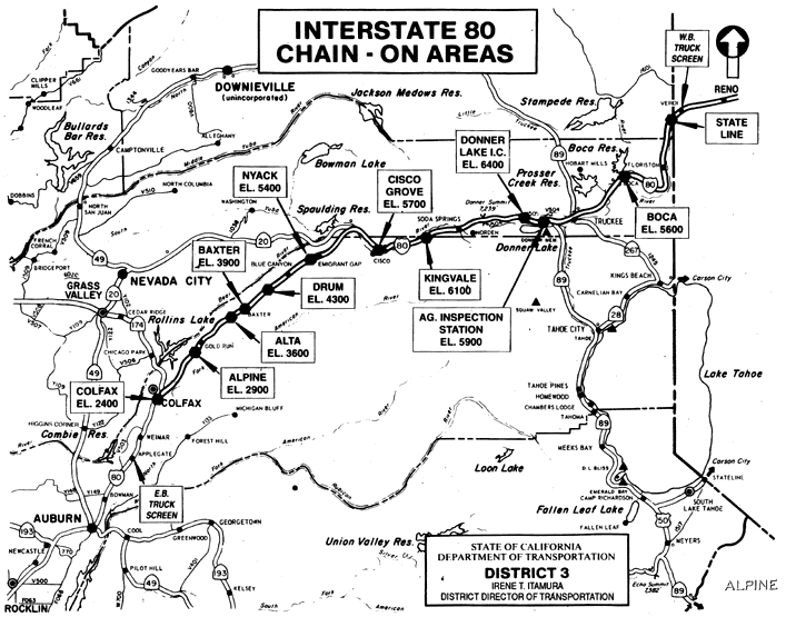 During a normal storm chains would typically be required from 1 mi. east of Baxter to Truckee eastbound and from Truckee to Kingvale westbound.