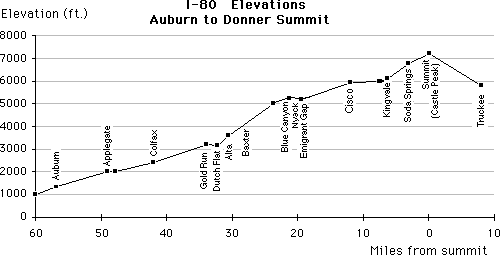 | Truckee, 89 S. [185], Lake Tahoe, Squaw Valley (11.5 mi.), Tahoe City (14 mi.) | 0.0 | 5818 | 9,994 | , Hospital, Gas, Diesel, Fast
